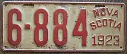 1923 | Embossed red serial on gray plate with border line; "NOVA SCOTIA 1923" at right | 12-345 | 1-001 to approximately 17-000 | |