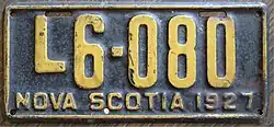 1927 | Embossed yellow serial on black plate with border line; "NOVA SCOTIA 1927" at bottom | L12-345 | L1-001 to approximately L19-000 | |