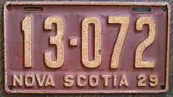 The Canadian province of Nova Scotia first required its residents to register their motor vehicles in 1907. Registrants provided their own licence plates for display until 1918, when the province began to issue plates.[1]