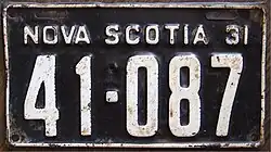 1931 | Embossed white serial on black plate with border line; "NOVA SCOTIA 31" at top | 12-345 | Coded by county group (1) | |