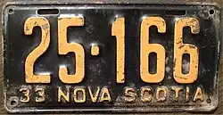 1933 | Embossed orange serial on black plate; "33 NOVA SCOTIA" at bottom | 12-345 | Coded by county group (1) | |