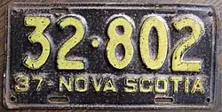1937 | Embossed yellow serial on black plate; "37-NOVA SCOTIA" at bottom | 12-345 | Coded by county group (1) | |