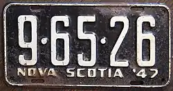 1947 | Embossed white serial on black plate with border line; "NOVA SCOTIA '47" at bottom | 1-23-45 | Coded by county group (1) | |