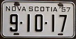 1957 | Embossed black serial on white plate with border line; "NOVA SCOTIA '57" at top | 1-23-45 12-34-56 |