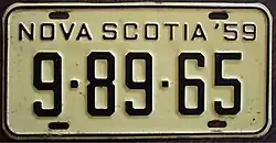1959 | Embossed black serial on light yellow plate with border line; "NOVA SCOTIA '59" at top | 1-23-45 12-34-56 |