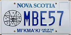 June 2018 | Embossed blue serial on white plate; eight-point star petroglyph screened at left; "NOVA SCOTIA" screened in blue centred at top | "MI'KMA'KI LAND OF THE MI'KMAQ" screened in blue centred at bottom | MBC12 | MAA01 to MCA12 (as of May 17, 2023) |