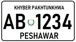 Plates are white with black letters and numbers. The plates consist of two letters and four numbers with the Khyber Pakhtunkhwa's coat of arms between them. Khyber Pakhtunkhwa is written above and the name of the issuing city below. Issuing cities are Peshawar, Charsadda, Nowshera, Abbottabad, Bannu, and Kohat. | |