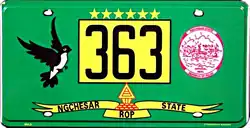 2019 | Black numbers on white background all centered in a black bordered box; green plate background with stars at top and banner at bottom | Ngchesar | |||
