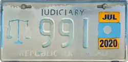 2020 | Light blue serial on silver background; light blue border; scale of justice to right of serial and flag to right | Blue "JUDICIARY" above serial number | 123 | Republic of Palau |