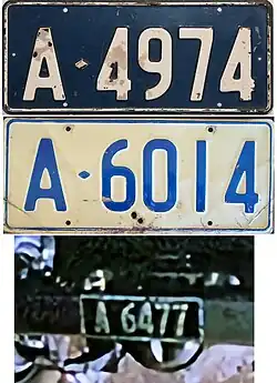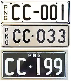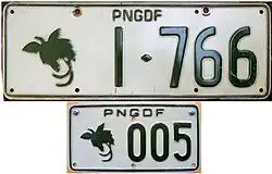 Registration plates used on Papua New Guinea Defence Force vehicles. The lower plate was as used on motorcycles. Introduced in 1975 at number 1-000, and withdrawn by the mid 1980s at 2-999. Motorcycle plates were made with the numbers 001 to 150. | ![]()