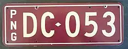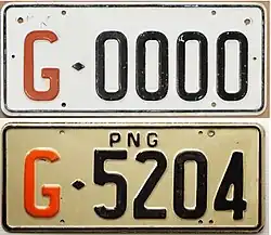 Registration plate used on vehicles belonging to the National Government of Papua New Guinea. Introduced in 1975 to reflect independence from Australia. | ![]() |