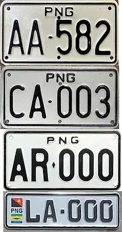 Papua New Guinea] (Papua Niugini in Tok Pisin) requires its residents to register their motor vehicles and display vehicle registration plates.[1] Motor vehicle registration is the responsibility of Motor Vehicle Insurance Limited (MVIL). Current plates are in two styles; Australian standard 372 mm × 134 mm, and use Australian stamping dies, and what is commonly referred to as "Euro Flag" style. The latter has the flag of Papua New Guinea and often a provincial flag from Morobe or Madang Province on the left. The stamping dies are German FE style.[2] Commencing in April 2025, flag style plates were no longer offered, reverting back to the standard Australian style. This commenced at LCG-000. Since the mid 1990s, plates have been issued with the first letter identifying the province of issue. As of 2025, most private and commercial motor vehicles use standard white plates with black lettering. Special number plates are issued to Consular staff, Diplomatic staff, Government owned vehicles, motorcycles, public motor vehicles (buses), taxis, trailers and to those engaged in selling or repairing vehicles. Especially in the provincial areas, many vehicles feature either just one plate, or a home-made alternative to replace a missing officially issued plate.