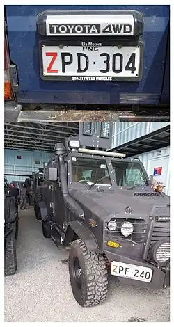| Plates with a red Z and in the range ZPD-000 to ZPD-999 and ZPF-000 to ZPF-999 are issued to police vehicles of the Royal Papua New Guinea Constabulary. |
