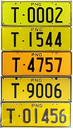 Taxi registration plates in the Euro Flag style, issued by Morobe Land Transport. These commenced at T-0000 to about T-0359. These were followed by T-02250 onwards. At least five sets of plates (T-0210 to T-0214) were erroneously made using the letter O instead of the number 0 (zero). |