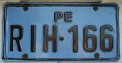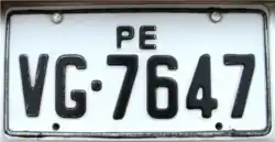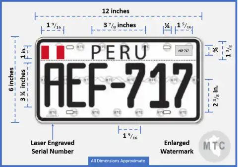 Peru requires its residents to register their motor vehicles and display vehicle registration plates.[1] Current plates are North American standard 6 in × 12 in (150 mm × 300 mm).