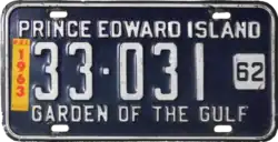 1962–63 | Embossed white serial on dark blue plate with border line; "PRINCE EDWARD ISLAND" at top; white box at right containing debossed "62" | "GARDEN OF THE GULF" at bottom | 12-345 | 20-001 to approximately 47-000 | Revalidated for 1963 with stickers. |