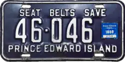 1976–80 | Embossed white serial on dark blue plate with border line; "PRINCE EDWARD ISLAND" at bottom; white box at right containing debossed "76" | "SEAT BELTS SAVE" centred at top | 12-345 | 19-790 to 99-999; 10-001 to approximately 12-000 |