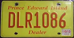Dealer | Embossed red serial on reflective yellow plate; "Prince Edward Island" at top, and "Dealer" at bottom | none | DLR1234 | |||
