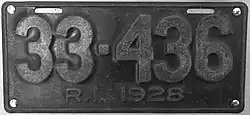 1928 | Embossed white serial on black plate with border line; "R.I. 1928" centered at bottom | none | 123-456 | 1 to approximately 108-000 | |