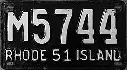 | 1951 | Embossed white serial on black plate; "RHODE 51 ISLAND" at bottom | none | A1234 12345 |