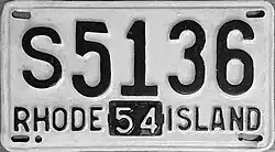 1953–54 | Embossed black serial on white plate; "RHODE 53 ISLAND" at bottom | none | A1234 | B1 to Z9999 | Revalidated for 1954 with black tabs. |
