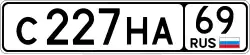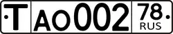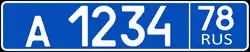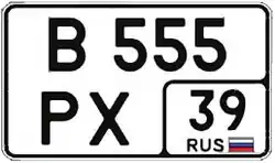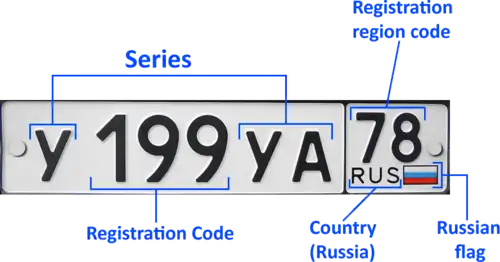 The current format uses a letter followed by 3 digits and two more letters. To improve legibility of the numbers for Russian cars abroad, only a small subset of Cyrillic characters that look like Latin characters are used (12 letters: А, В, Е, К, М, Н, О, Р, С, Т, У, Х), additionally D was issued on some very early plates.[1] Finally, the region number (77, 97, 99, 177, 197, 199, 777, 797 and 799 for Moscow; 78, 98, 178, and 198 for Saint Petersburg, etc.) and the international code RUS with the 1991 to 1993 Russian flag typically to the right of it, however the flag is not mandatory, and since 2013 owners may order plates without it.[2]