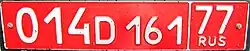 | Diplomatic cars have white characters on a red background. The first three digits on the plate are a code identifying the embassy to which they belong, assigned in order based on the date at which that country established diplomatic relations with the Soviet Union or post-Soviet Russia (but not Russian Empire, so it starts with the recognition of the Soviet Union by the Great Britain). For example, the United Kingdom is 001, the United States is 004, and South Sudan is 168. Numbers 500 and above identify international organizations, such as 505 for IMF. On ambassadors' cars this code is followed by CD and a digit (004 CD 1 77 rus), while cars assigned to rank-and-file diplomats have this code followed by D and three digits (for example, 004 D 108 77 rus). The lacking diplomatic status administrative and technical staff of embassies, consulates or international organizations have license plate format (004 T 001 77 rus). | |