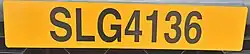 | Black text on a yellow background. | "SLG" followed by up to four digits. | For government vehicles. |