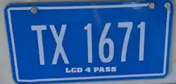 White text on a blue background. Sometimes indicates the licensed number of passengers. | "TX" followed by up to four digits. | For taxis. | ||