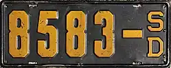 1915 | Embossed yellow on black; vertical "SD" at right | none | 12345 | 1 to approximately 28700 | |