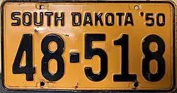 1950 | Embossed black on orange with border line; "SOUTH DAKOTA '50" at top | none | 1-1234 1-A123 10-123 10-A12 10-1A2 10-12A |