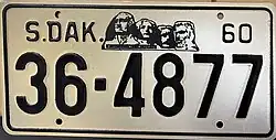 1960 | Embossed black on reflective tan with border line; "S.DAK.", stamped Mount Rushmore graphic and "60" at top | none | 1-12345 10-1234 |