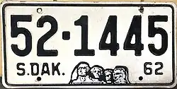 1962 | Embossed black on reflective white with border line; "S.DAK.", stamped Mount Rushmore graphic and "62" at bottom | none | 1-12345 10-1234 |