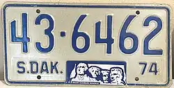 Coded by county of issuance (1 or 10) | First screened graphic license plate in the United States. Awarded "Plate of the Year" for best new license plate of 1974 by the Automobile License Plate Collectors Association, the first time South Dakota was so honored. |