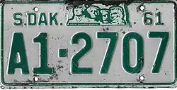 1961 | Embossed green on reflective white with border line; "S.DAK.", stamped Mount Rushmore graphic and "61" at top | none | 1-12345 10-1234 |