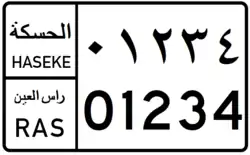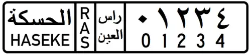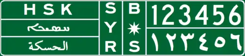 As for the Jazira Region, license plates are issued for each of the Districts under its jurisdiction, bearing in mind that Ras al-Ayn (Sere Kaniye) District is under Turkish occupation. Alongside Arabic names and 3-letter Kurdish codes, license plates of Jazira Region also generally show jurisdiction names in the Syriac Language of the ethnic Assyrian Minority of the region. For example, for the district of Qamishli, the 4-letter Syriac code "ܩ ܡ ܫ ܐ" is used, four disconnected letters that are meant to be an abbreviation of the Syriac name of Qamishli, "ܩܡܫܠܐ". For the district of Hasaka, the full name of the district in Syriac, "ܚܣܝܟܐ" is used.