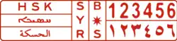 - The left-most section: At the top the name of the governorate in Arabic and below that the registration number (a maximum of 6 digits) in Arabic numerals. The governorates are listed in the table below.