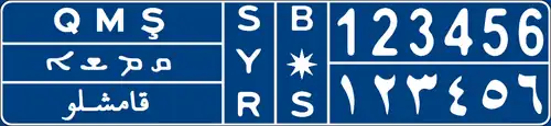 Vehicles of security forces, such as Asayish forces and Sutoro forces, have plates that are blue with white text.