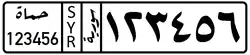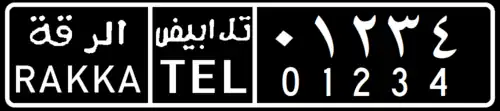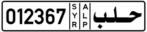 The Syrian license plates since 1997 have black lettering on a white background.[5] The plate is divided into 4 sections (when viewed from left to right):