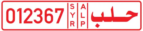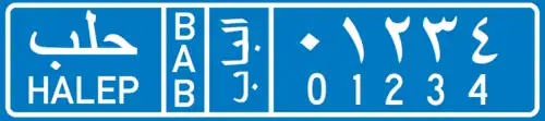 License plates of Syrian Interim government no longer show the name or 3-letter code for Syria. They do show the name of the governorate in Arabic and in Turkish. Furthermore they show the name of the "local council" in which the vehicle is registered. These "local councils" generally match Syrian subdistricts with exceptions such as Al-Bab Subdistrict that has been divided into three "local councils" of al-Bab, Bizaah, and Qabasin. Each subdistrict is also shown with a 3-letter Turkish code. The numbers on the plates are 5-digits, starting with 00001. While license plate configurations from localities in all of the three Turkish-occupied governorates of Aleppo, Raqqa, and Hasaka have the same elements and very similar configuration, their designs (font, orientation of text, size of letters, etc) differ slightly.