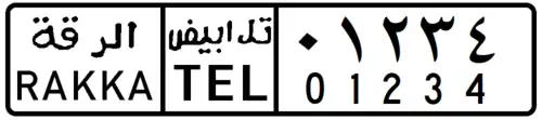 The license plates for the area under the control of this entity are issued based on governorates, similar to the practice in areas under the rule of the Damascus-based government. However, the configuration and style has changed significantly. The name of the governorate is written in Arabic, on the right hand side. The "SYR" national identity strip has been maintained in the middle, but a 3-letter governorate identity strip has been added.