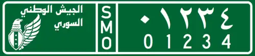 License plates installed on vehicles of "Syrian National Army" (SNA) also known as "TFSA" (Turkish-backed Free Syrian Army) have a green background and white text. These license plates do not display governorate and locality name, instead they show the name and logo of the "Syrian National Army" . These license plates display a 3-letter Turkish code "SMO", standing for the Turkish translation of the name of SNA Suriye Millî Ordusu.[10]