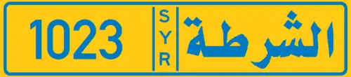 Police vehicle license plates do not show the governorate. They simply show the Arabic word "الشرطة" (Al-Shurta) meaning "Police". They have a yellow background and blue-coloured text. Their numbers consist of 4 digits.