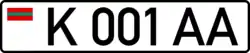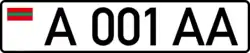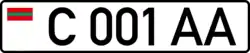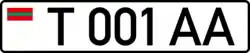 Standard license plates of Transnistria are 520 mm wide and 112 mm high, made of metal with 6 embossed characters - one letter, three numbers and two more letters - written using the DIN 1451 Mittelschrift font. On the left part of the plates there is also a modified euroband on a white background, having the flag of the PMR instead of the EU symbol. A holographic sticker in the place of the international country code underneath it was placed until 2015, when a law was revised, additionally removing black separation line between euroband and registration number;[1] instead, two interpolated grey sine waves were added on the bottom of the plate. Government plates only have 5 embossed characters - three numbers and two letters. Only symbols that are common to both the Cyrillic and the Latin alphabets are used, and with their Cyrillic meaning (A, B, C, E, H, K, M, P, T, X, Y). Its current design derives from Moldovan plates of 1992 design, but is slightly changed. Military plates are using Soviet design from 1959, and tractor plates are also using Soviet design, but from 1980.