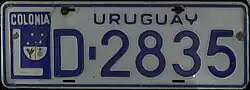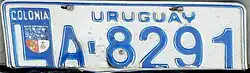 Colonia Department | LA-1234 | blue on white | "COLONIA" debossed within embossed square that contains the "L"; "URUGUAY" at top. Some plates have a full-color seal, while others do not. |
