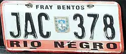Río Negro Department—Fray Bentos city | JAB 123 | black on white | "FRAY BENTOS" at top, "RIO NEGRO" in orange band at bottom |