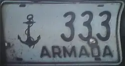 These license plates do not use the icons that would normally correspond to an Intendancy, but an emblem always shown at the center belonging to one of the three branches of the Armed Forces of Uruguay, the series of these license plates are the same throughout the country.