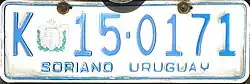 Soriano Department | K 12-3456 | blue on white | "SORIANO URUGUAY" at bottom |