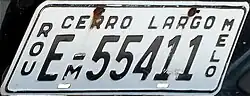Cerro Largo Department—Melo city | EM-12345 | black on white | "CERRO LARGO" embossed at top; "ROU" embossed vertically at left; "MELO" embossed vertically at right; the small M below the hyphen also indicates the city |