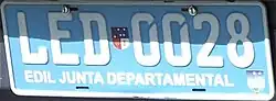 Departmental Assembly | Edil Junta Departamental | EDIL JUNTA DEPARTAMENTAL | AED 1234 | white on light blue; screened type designation |